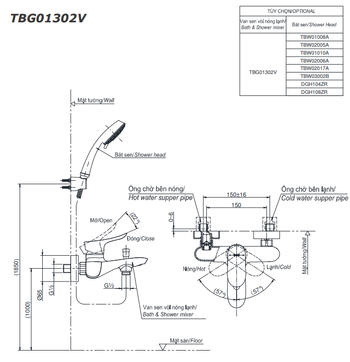 Bản vẽ kỹ thuật vòi sen tắm nóng lạnh TOTO TBG01302VA
