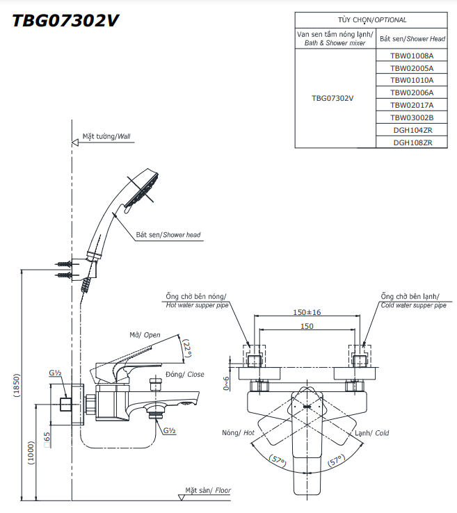 Bản vẽ kỹ thuật củ sen tắm nóng lạnh GE Series TOTO TBG07302VA