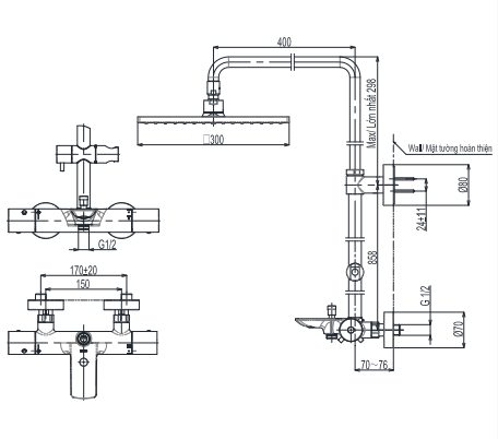 Bản vẽ kỹ thuật sen cây nhiệt độ tắm đứng kèm vòi xả bồn dòng G TOTO TBW08405A